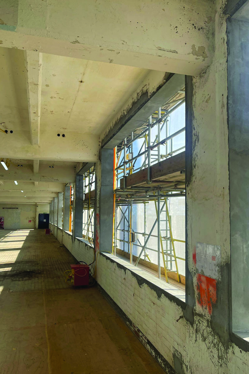 The main priority for this project is to provide a consistent finish to the window openings to allow for the installation of the newly manufactured frames. The fabric repairs must be consistent with the requirements of English Heritage and sympathetic to the original build which took place back in 1912. Original coatings are being removed using grit blasting techniques as well as for the preparation of the substrate for the Monotop system.
