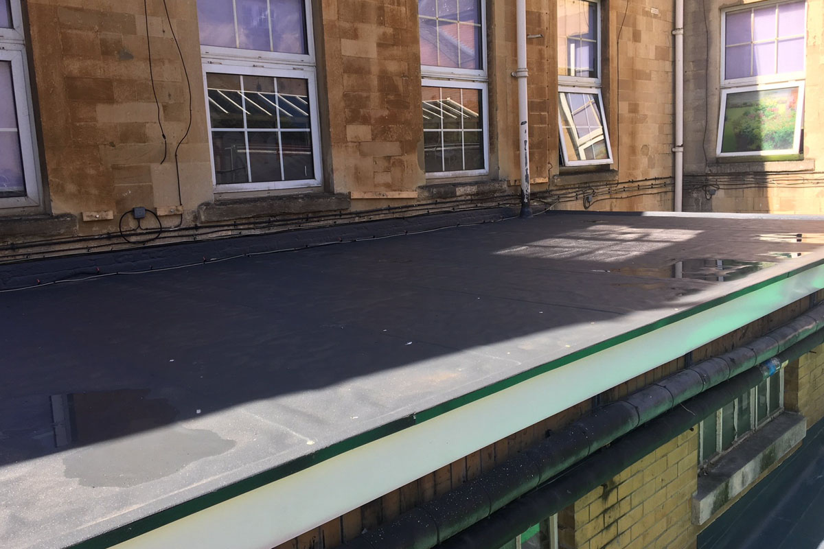 Our solution was to clean & prepare the existing roof finish, apply Prokol primer, and in some instances lay roofing membrane consisting of an impregnated polyester reinforcement, coated on both sides with flexible coating bitumen and bottom side provided with a build‐in vapour diffusion layer based on diamond‐shaped profiled self‐adhesive SBS modified bitumen.